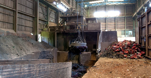 ミヤザキ・メタルサービス三重支店では2基の天井走行クレーンはじめ各種設備・重機を取り揃えており、大型スクラップの荷下ろしに対応しています。