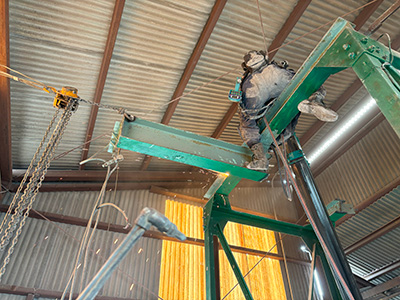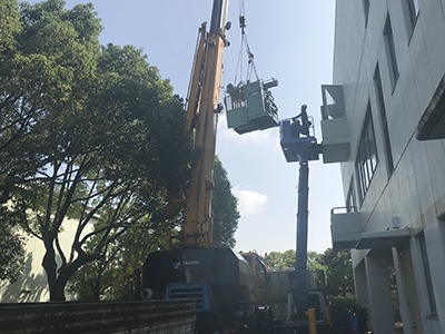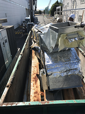高所作業車と共同で集塵機を解体・撤去している様子です。