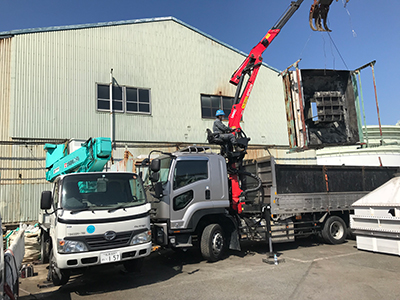 クレーンによる荷積みからツカミでの減容・養生までの様子です。