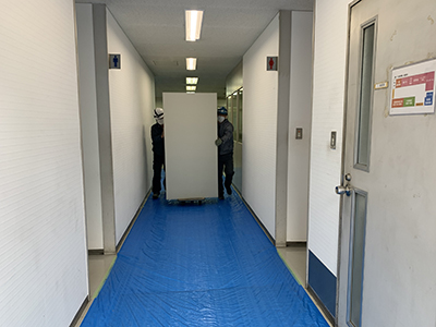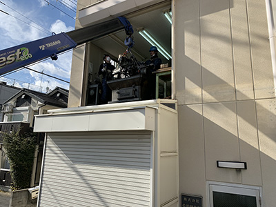 機械商社さんからの依頼にて、大型プロッターの解体撤去を行いました。 設備が建屋の2階に設置されていたことから、小バラシして搬出しなければならない中、建屋が工場から事務所仕様になっており火気の使用は不可。ボルト個所でバラし相応に大きな状態で出すことになったものの搬出可能な開口部は窓のみ。 以上の状況から建屋外にローリングタワーを設置して長尺部材を預け、ユニックで下ろす工法に決定。 単体で300kgを超える部材もあったことから、窓枠まではスロープを設営して建屋へのダメージを防止。単純な搬出が難しい状況であっても、それぞれの現場状況に沿った方法を選択し、ご提案するように致します。